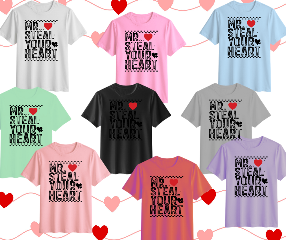 Sweet, simple, and full of charm 💘 — this Mr. Steal Your Heart tee is perfect for your little Valentine! Featuring a bold red heart and arrow design, it’s a classic look that pairs perfectly with any Valentine outfit.