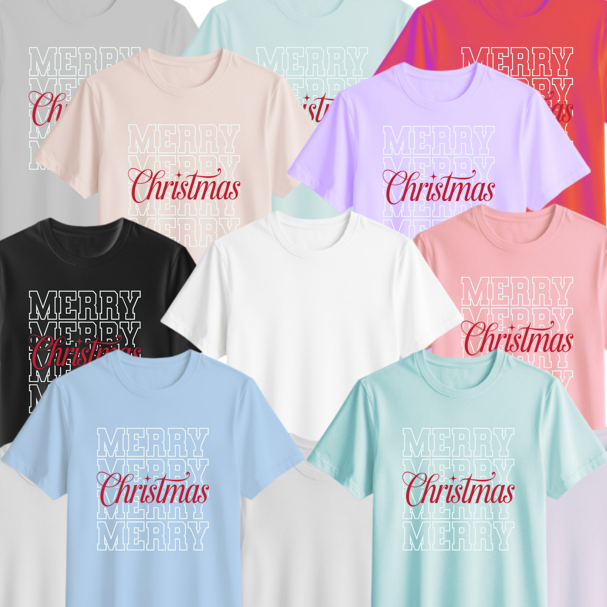 This Merry Merry Christmas tee features a trendy stacked varsity-style design with a festive red “Christmas” script overlay — the perfect mix of classic and modern holiday vibes. Whether you’re trimming the tree, baking cookies, or snapping Christmas photos, this comfy tee is a must-have for the season.